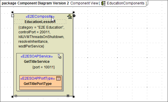 First, you will enter the new names of the xUML service components and change the port number of the SOAP service component, so both services (lesson 1 as well as lesson 2) can be run at the same time. Click the <<E2EComposite>> component EducationLesson1 to select the element: