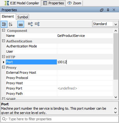 Select the service component GetTitleService in the diagram pane. In the Properties tab, change it's name to GetProductService and change the Port to 10012. Switch back to the E2E Model Compiler tab: