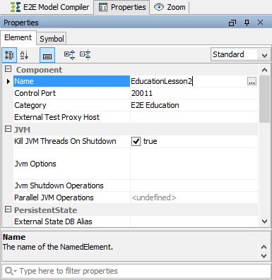 Switch to the Properties tab in the lower left corner of Magic Draw (where the Model Compiler is situated, too). Change the name of the component to EducationLesson2: