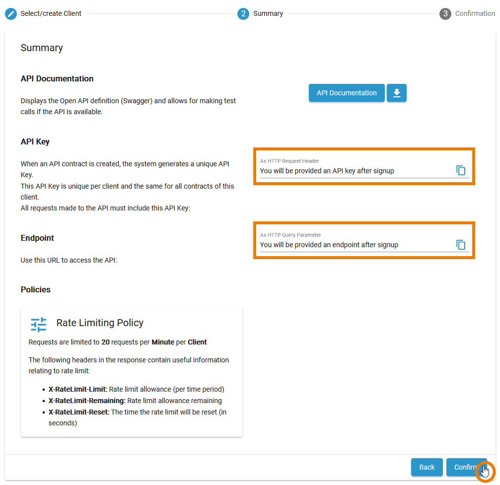 In step 2, the summary displays the API-related information. Click Confirm to send your request: