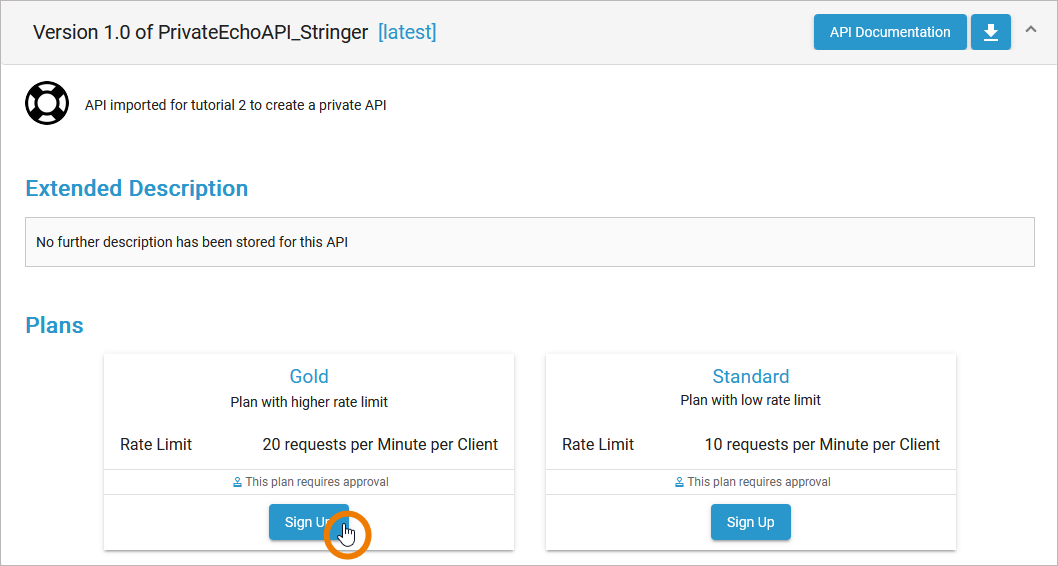 In the Plans section, you find all available plans for the API and information on whether approval is required for a plan. Click Sign Up on plan Gold: