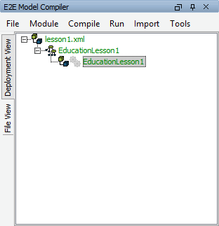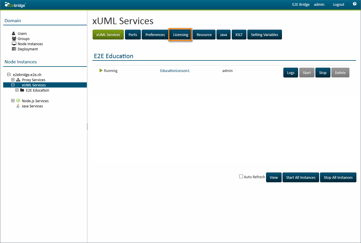 Expand the node e2ebridge.e2e.ch in the tree. Expand the entry xUML Services and the category E2E Education to see all deployed xUML service (here only EducationLesson1):