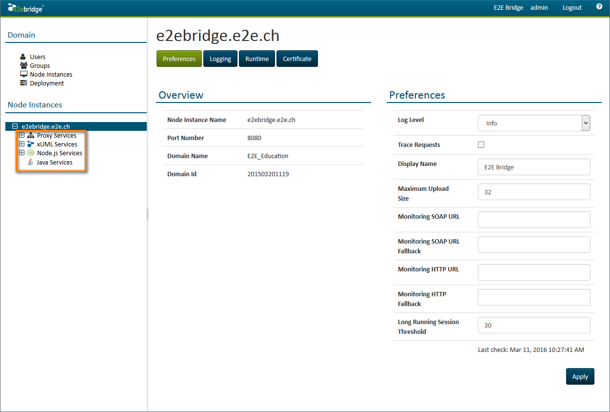 Select the node instance (here e2ebridge.e2e.ch ) in the navigation panel on the left. The preferences of the node instance are displayed. Expand the navigation item by clicking the plus-sign. Four navigation items appear: Proxy Services, xUML Services, Node.js Services and Java Services: