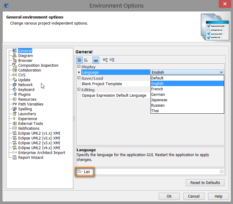 We recommend choosing English in the language setting of MagicDraw, because the education documentation is built with the English version.