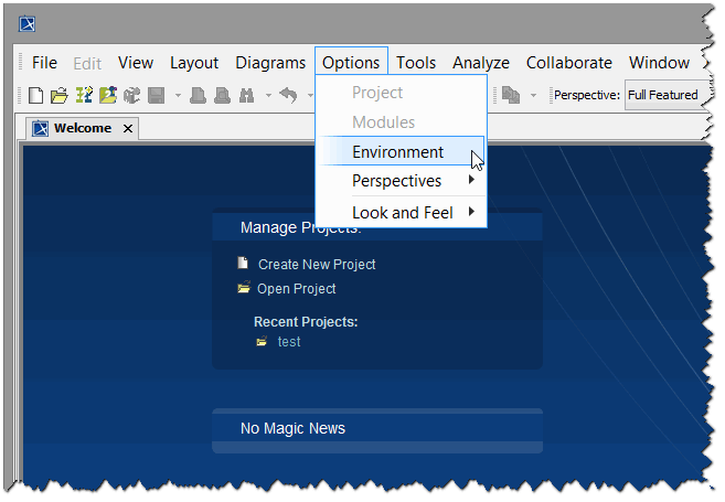 Apply the E2E Modeler perspective to MagicDraw as described in Builder for MagicDraw Basics.