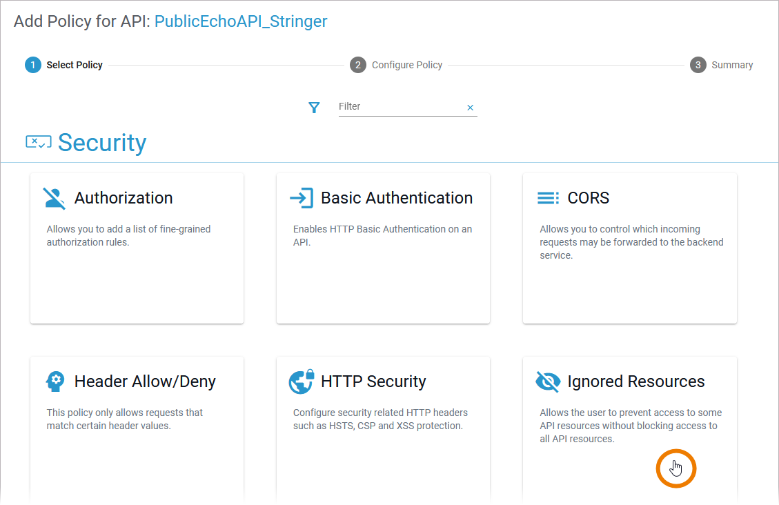 This configuration will prohibit POST requests to the HelloWorld resource. Click Next to display the summary and Save to finally attach the policy. The Ignored Resources Policy now is displayed on the API's detail page > tab Policies: