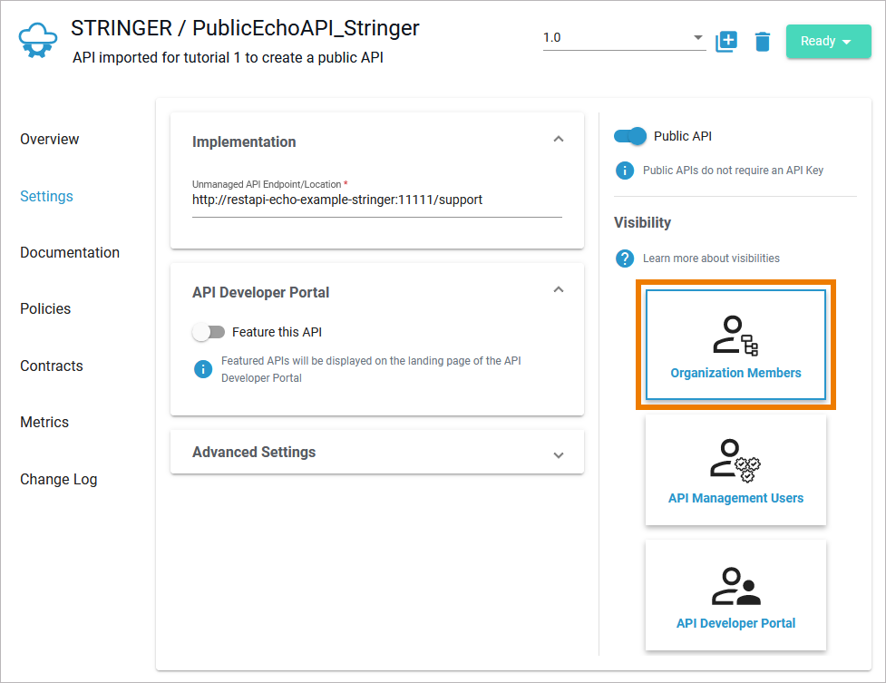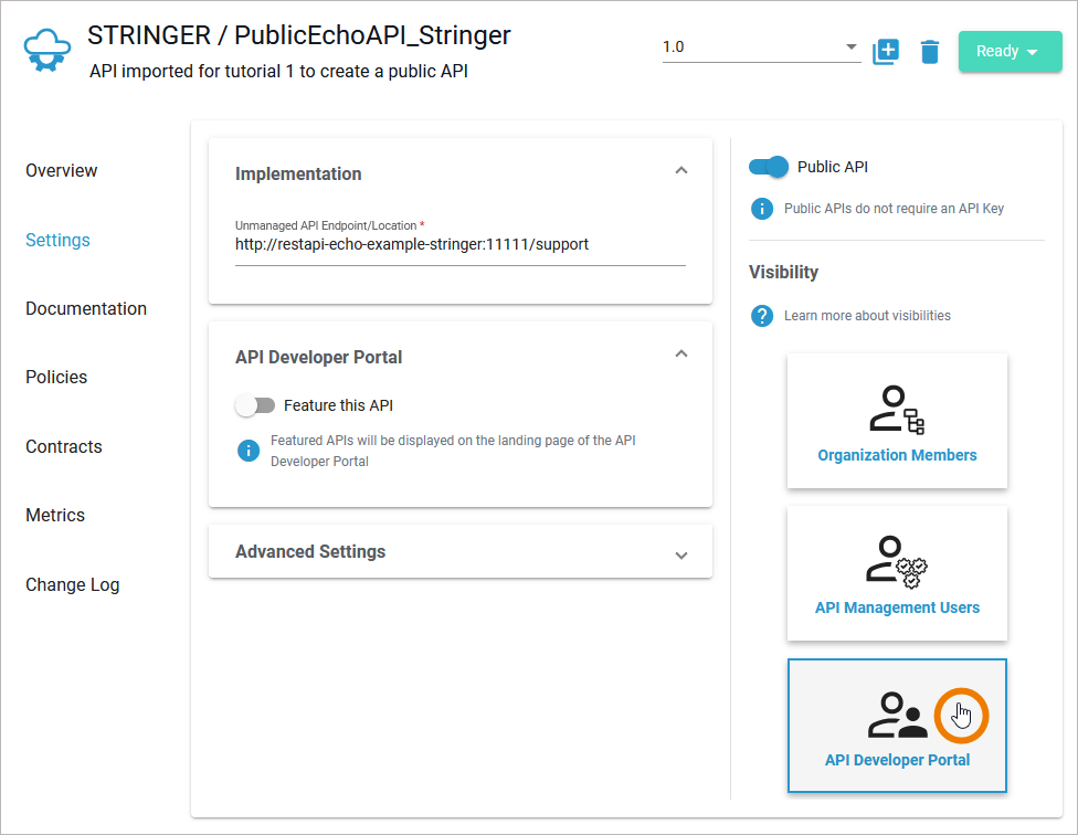 Once you have completed the configuration of your API, you must publish it. Only published APIs can be consumed by customers. Since all mandatory configuration of your API has been finished, your API is Ready to be publishd. Click the status label and publish your API: