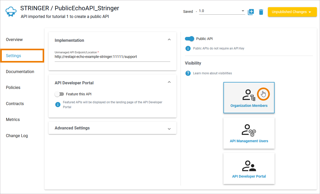 Your API is now still public, but can only be found by members of your organization. Re-publish the API to apply the change: