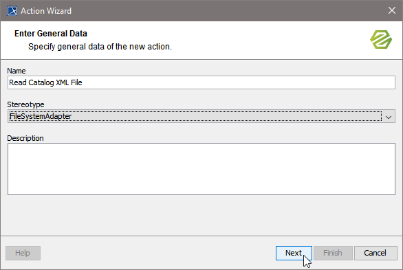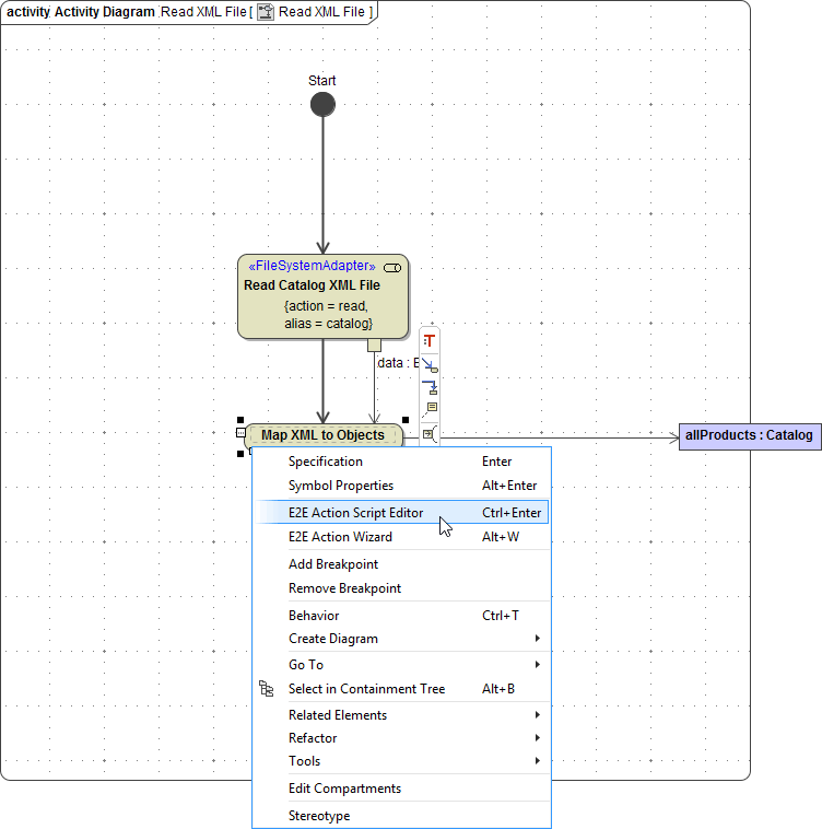 Now, you are going to implement the file reading by the help of the Action Wizard. Select the action node Read Catalog XML File and choose E2E Action Wizard from the context menu: