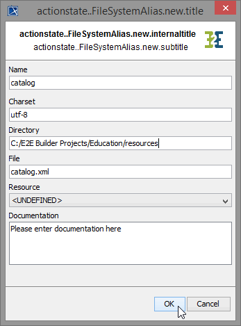 Now specify the file details. Assign the name catalog to the new alias. Specify the directory, in which the file catalog.xml can be found and enter catalog.xml as the name of the file to be read via this alias. Click OK and Next: