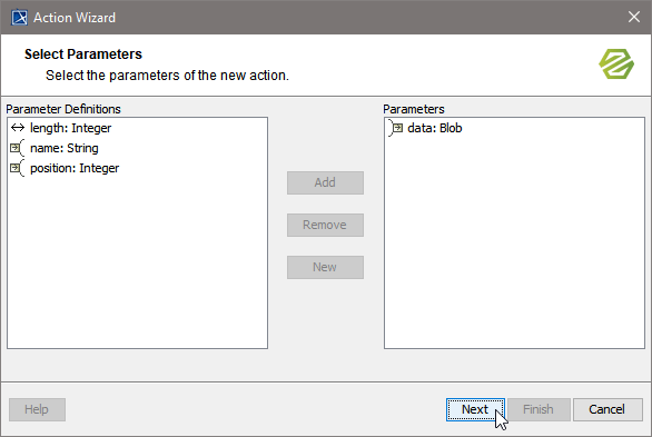 Remember that the read data is stored in an object data of base type Blob. This object now is suggested from the wizard as a parameter. You do not need any further parameters. Click Next: