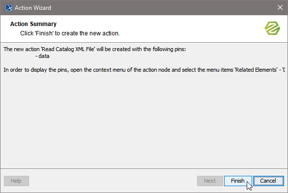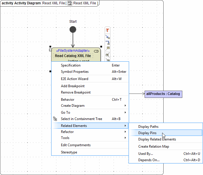 To display the object data, open the context menu of the action node Read Catalog XML File. Choose the item Related Elements > Display Pins: