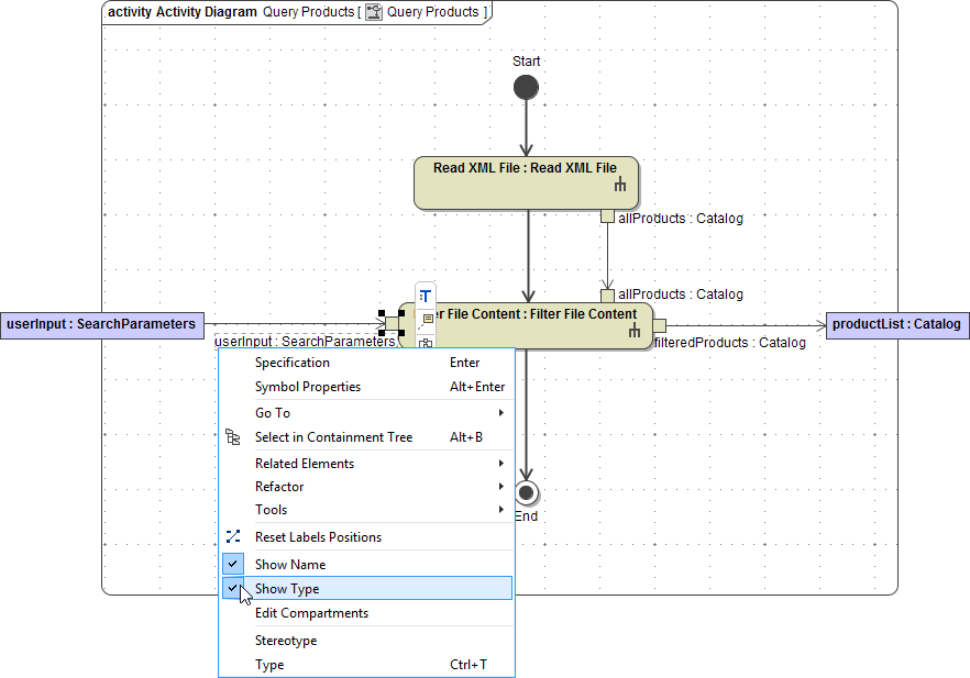 Return to the activity diagram Query Products. Drag and drop the activity Read XML File to the diagram pane. A new action node including the output pin allProducts is created on the diagram pane. As allProducts is an output pin, move it to the right side of the action node: