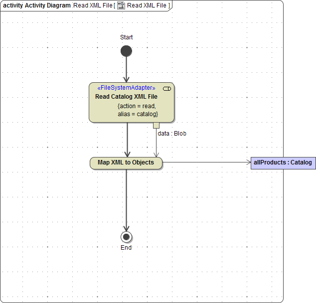The stereotype <<FileSystemAdapter>> you have defined on the action node is displayed in blue. The tagged values action=read and alias=catalog are also displayed. The action is ready to read the XML file using the file system adapter (once the backend is defined in the component diagram). The alias is used to look up the path and name of the file in the component diagram.