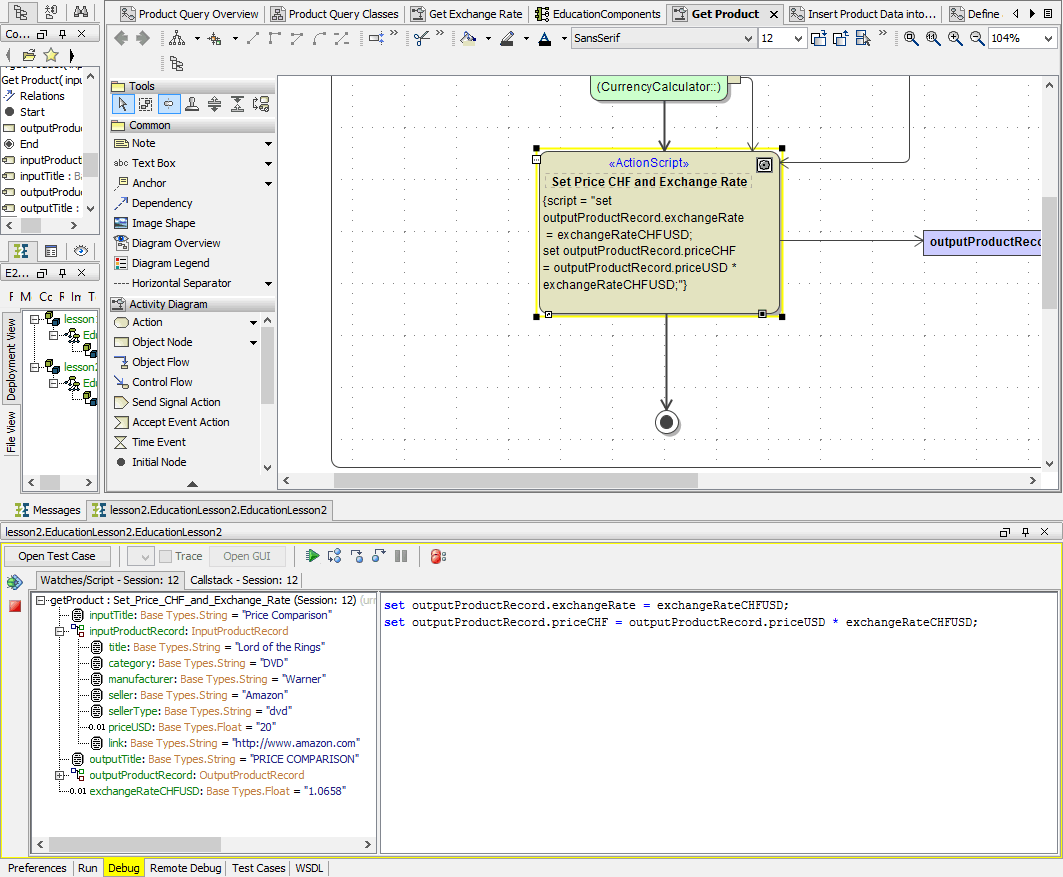 All attributes of your input data are shown in the output object outputProductRecord. Note, that the value of the exchangeRate is also being displayed. It was set in the activity diagram Set Price CHF and Exchange Rate. The price in CHF was also calculated as defined in the action script.