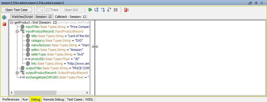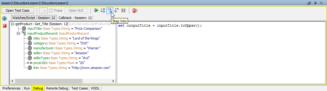 In the watches part in left panel of the debug window, you can see the input values. In the right panel, the debugger displays the action script statement highlighted that will be executed next: set outputTitle = inputTitle.toUpper();