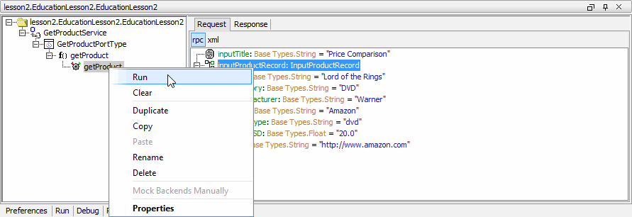 The automatically created test case getProduct is displayed. It is marked with a gearwheel icon_test_case_gray.png. The gearwheel in gray color indicates that the test case has not yet been run. On the Request tab in the right panel, both input parameters inputTitle and inputProductRecord are displayed.