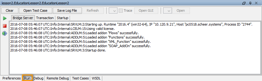 The Runtime window deploys the service to the internal server of the development environment and starts it in the Embedded Runtime. This is logged to the Run view. Remember that using the Embedded Runtime, the service will always be deployed to localhost.