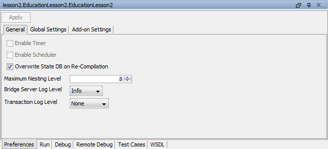 In this chapter, you are going to step through the lesson 2 model with the Interactive Debugger to recall the features of the debugging tool. Start the service in debug mode. If you do not stop the running service before, the runtime will stop the service and restart it in debug mode.