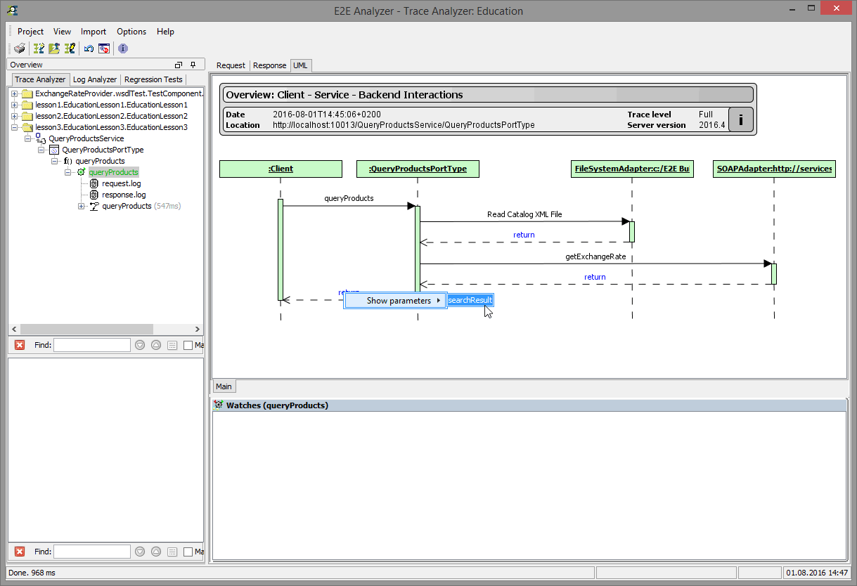 You can see the Query Products service reading the XML file and calling the external Web service on services.e2ebridge.com. Trace through the UML model. The output parameters can be visualized in the Watches panel by right-clicking the message return and selecting Show Parameters: