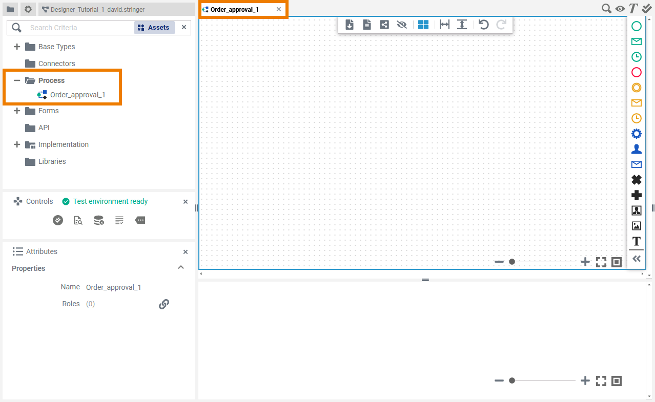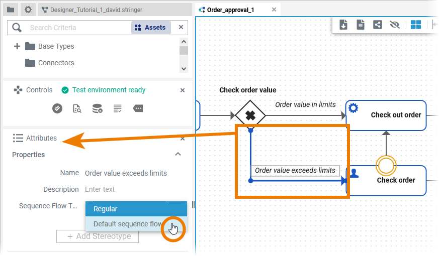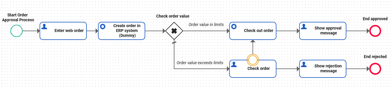 To gain some experience first, David will implement a simplified process in a first iteration: the part of the process that does the automated processing if an order is within the limits.