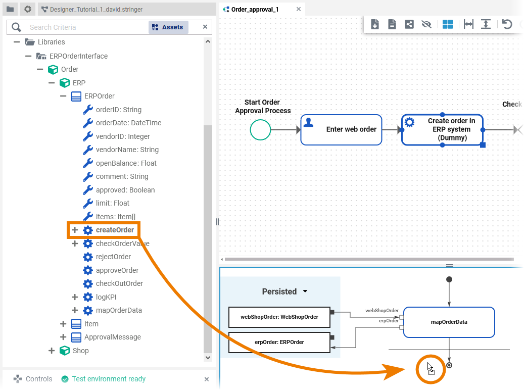 Provide erpOrder as input data to createOrder by drawing the object flow as depicted:
