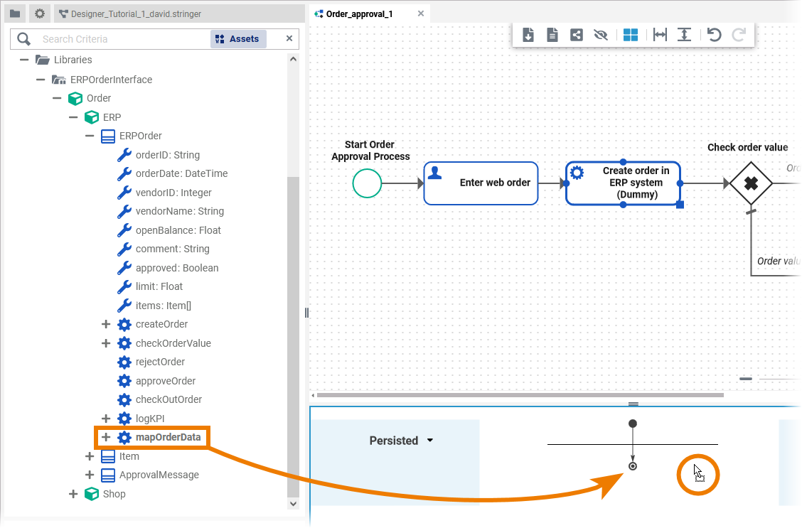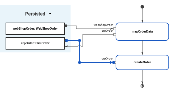 Drag and drop class ERPOrder (from ERPOrderInterface > ERP > ERPOrder) to the Persisted section of the execution canvas. This creates one more persisted variable (erpOrder : ERPOrder) to store the mapped order data returned by the mapOrderData operation: