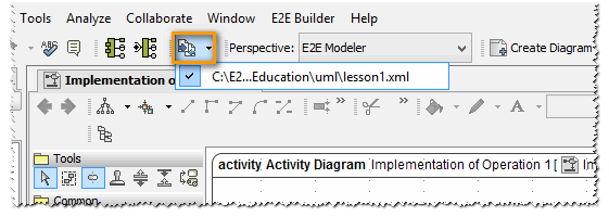 In the title bar of the MagicDraw window, the name of the currently opened model (lesson1.xml) is shown, followed by the path of the currently opened Builder project displayed in brackets [C:\E2E Builder Projects\Education\uml\].