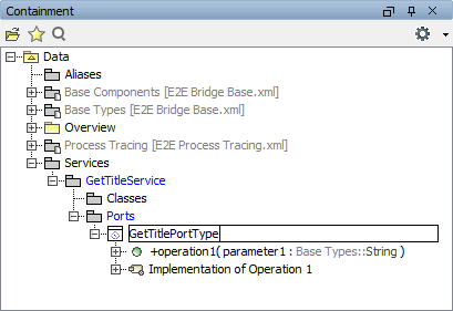 Open the package Data / Services / GetTitleService / Ports and expand the port type class NameOfPortType1. Below the port type class, you find the operation operation1 and its implementation, the activity Implementation of Operation 1. We recommend storing the implementation of an operation always below the corresponding class node in the containment tree: