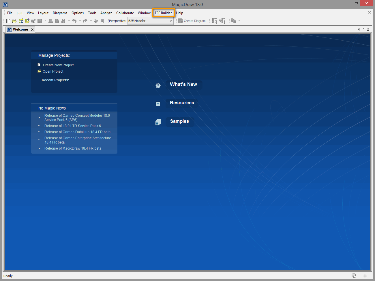 This chapter describes how to open existing Builder projects like the E2E Examples. After opening MagicDraw, the new E2E Builder menu item is visible in the menu bar.