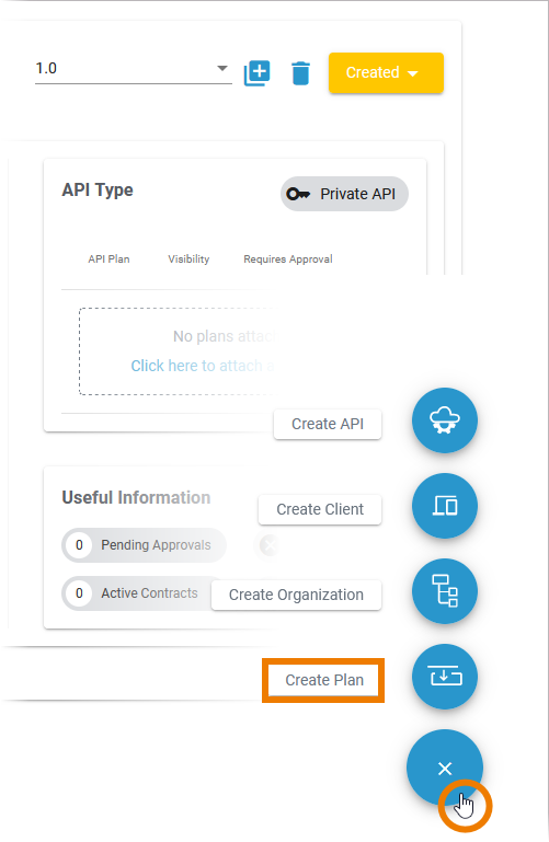 No matter where you are in the API Management, the Create button is always displayed at the bottom right and opens the creation menu. Open the menu and click Create Plan to add a new plan: