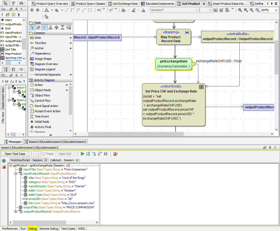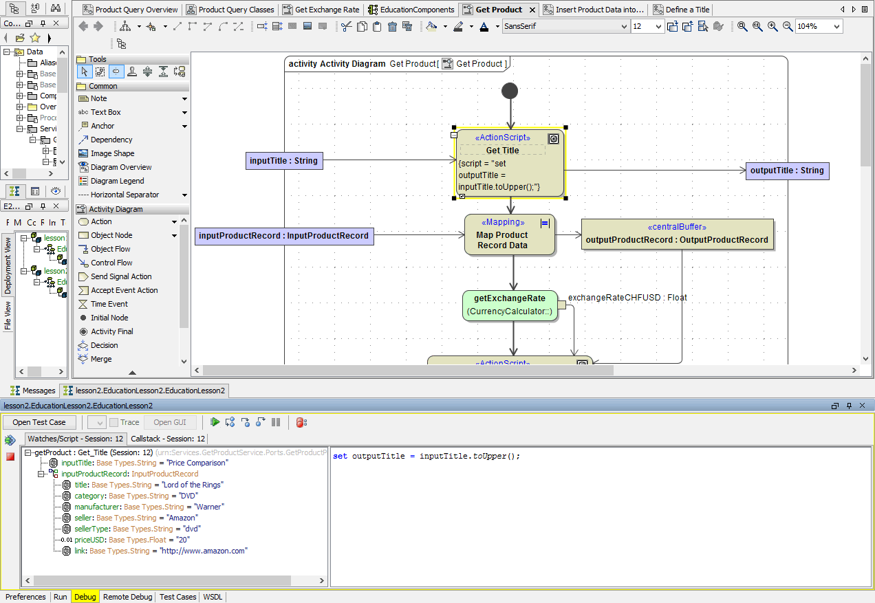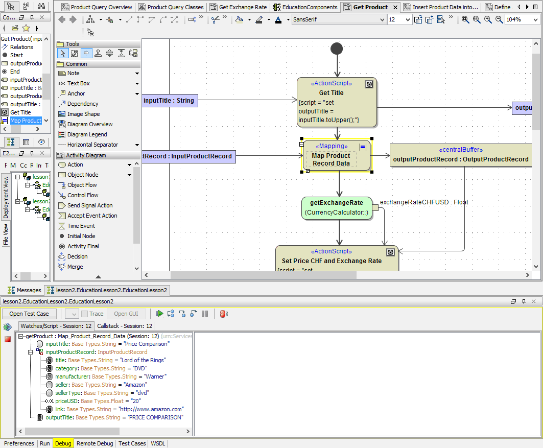 The watches panel displays the mapped data in outputProductRecord. In the activity diagram of activity Get Title the debug focus switched to the call operation action getExchangeRate.