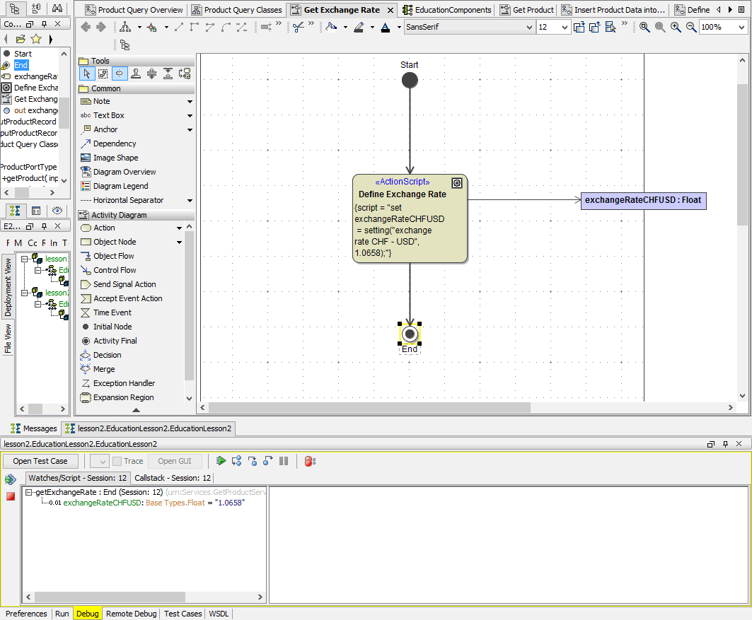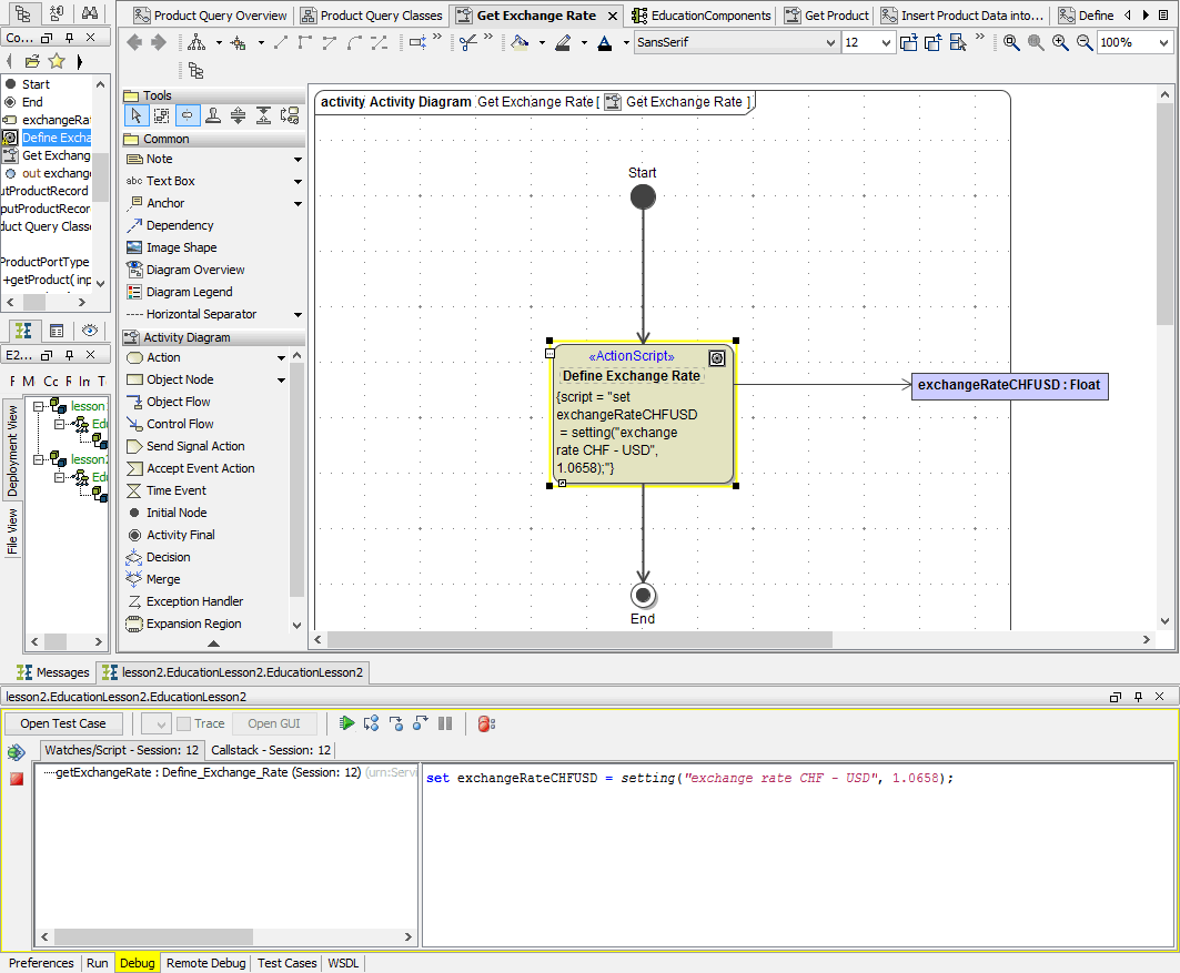 The call operation action getExchangeRate was implemented in activity diagram Get Exchange Rate. As you stepped into the call operation action, the debugger switched to the corresponding activity diagram in the diagram pane.