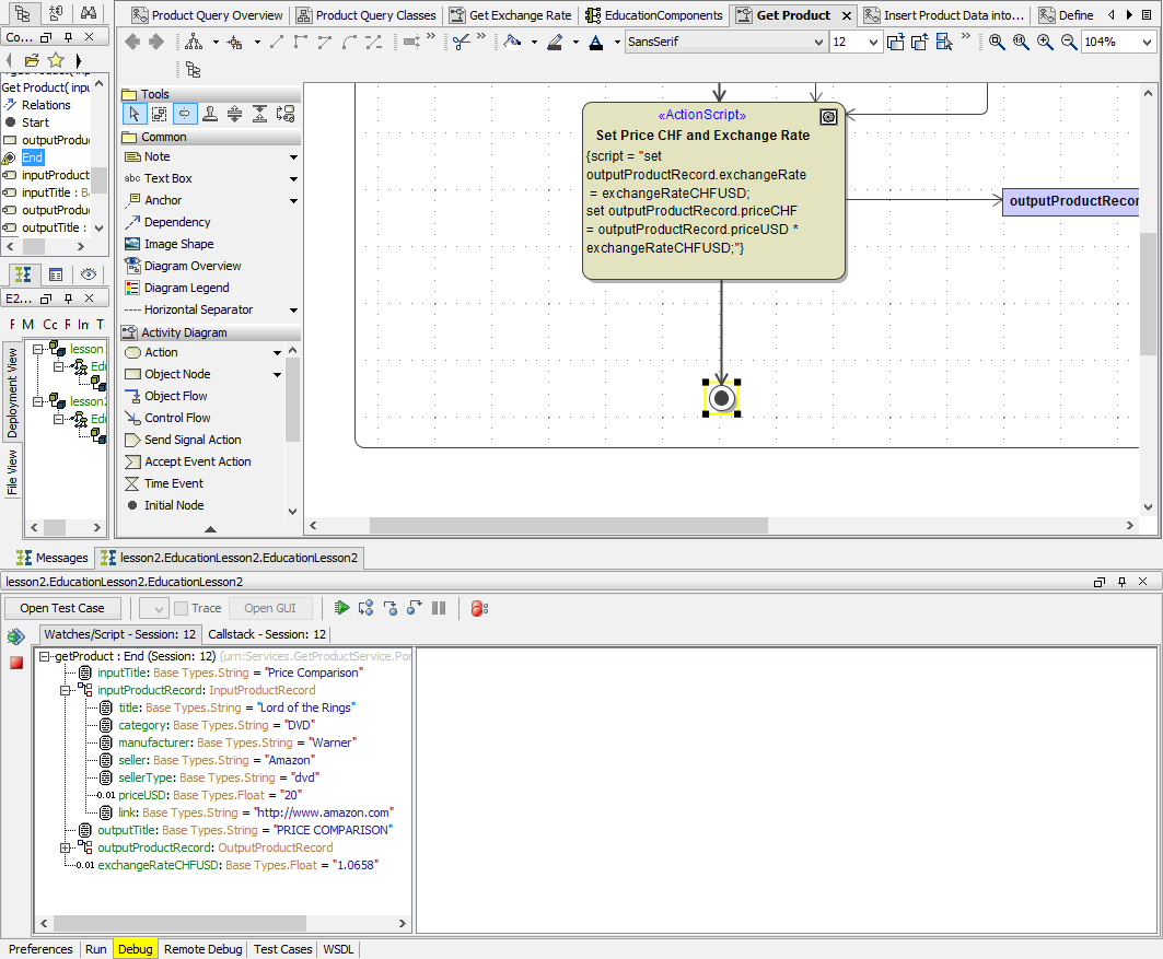 All attributes of your input data are shown in the output object outputProductRecord. Note, that the value of the exchangeRate is also being displayed. It was set in the activity diagram Set Price CHF and Exchange Rate. The price in CHF was also calculated as defined in the action script.