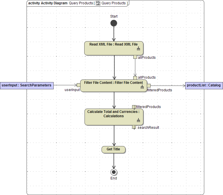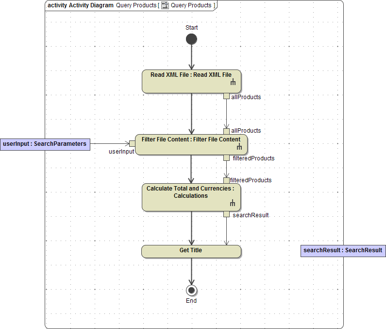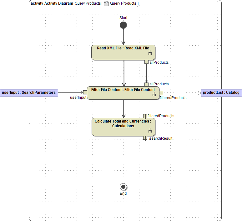 Delete the control flow between the action node Filter File Content and the activity final End. Drag and drop the activity Calculations on the diagram pane. Assign the name Calculate Total and Currencies. Move the pins filteredProducts and searchResult on the right side of the action node. Draw a control flow from Filter File Content to Calculate Total and Currencies:
