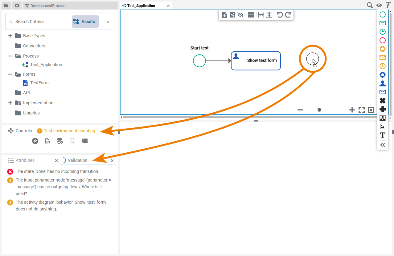 The test environment is initialized automatically when you start working on a service. As soon as you make changes in the Designer, the test environment is updated to reflect your changes. In addition, your actions are constantly compiled and validated. Compilation errors are displayed in the validation panel. Check the panel for errors and warnings to resolve any problems that occur in your service. Refer to Validation Panel in the Designer Guide for details.