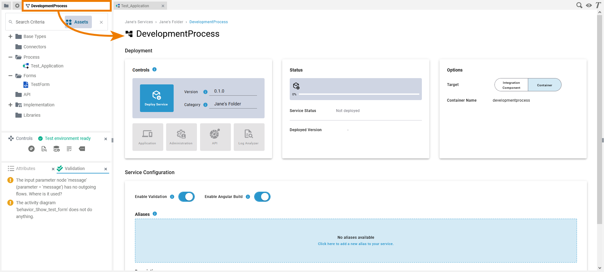 With PAS 23.1, the development process in the Designer has been optimized. To speed up and simplify the development process, we have decoupled development from deployment: Developers now work in a test environment where they can get constant feedback on their changes and can test them directly against the service preview.