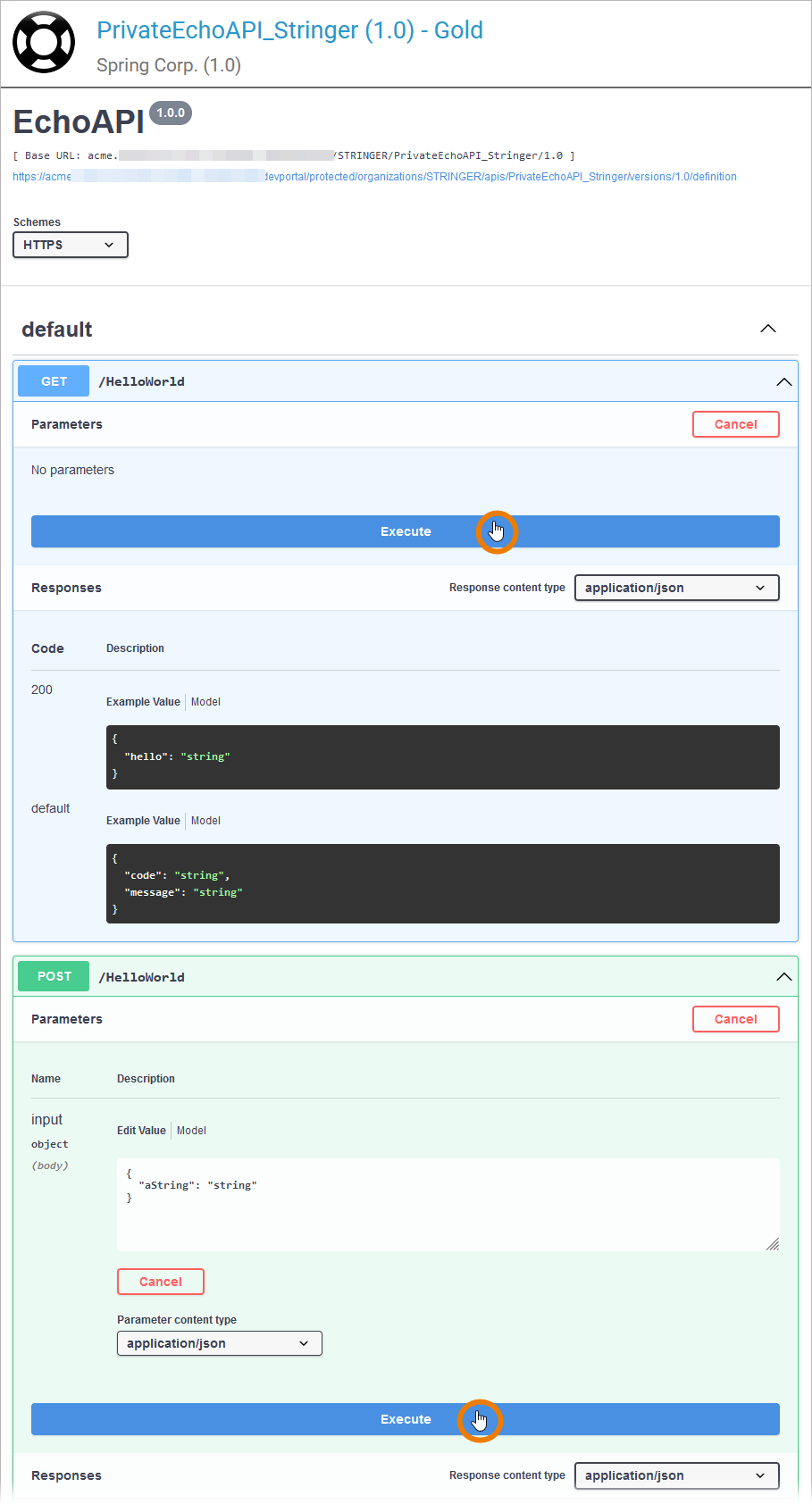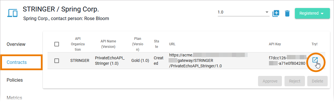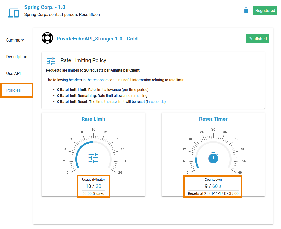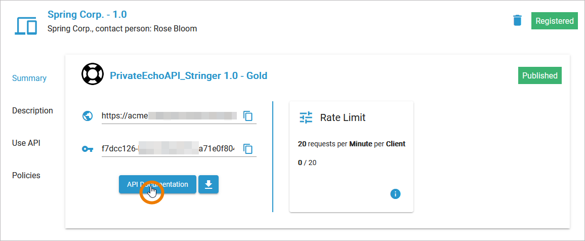 The PrivateEchoAPI can now be consumed by Spring Corp.. To calls from Spring Corp. the Gold rate limiting will be applied. It needs to supply an API Key to be able to consume the PrivateEchoAPI.