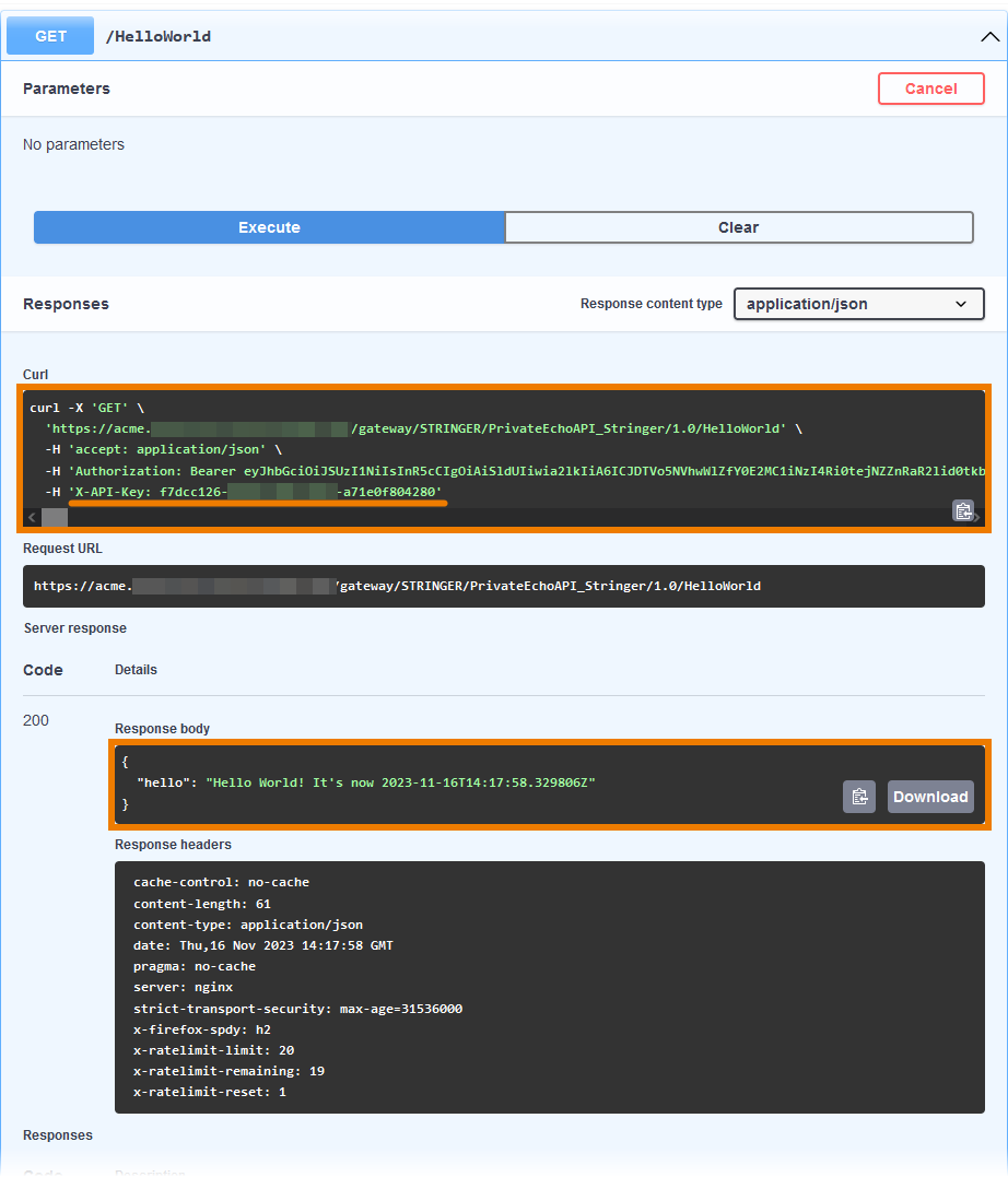 As displayed in section Curl, the API Key is provided correctly with the cURL call. In the Response body section, you can see the actual response of the service. The call returned the string Hello World! along with the current timestamp: