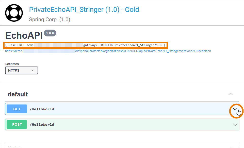 At the top of the page, the Base URL and the link to the API definition are displayed. Expand the displayed operations to start testing: