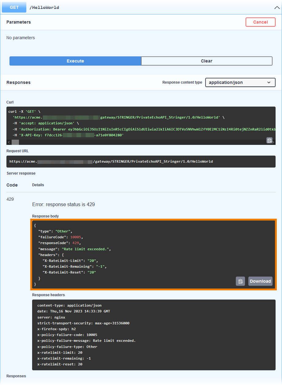 As configured in tutorial step 2, clients using plan Gold should be able to execute 20 requests per minute. Click Execute more than 20 times in succession.