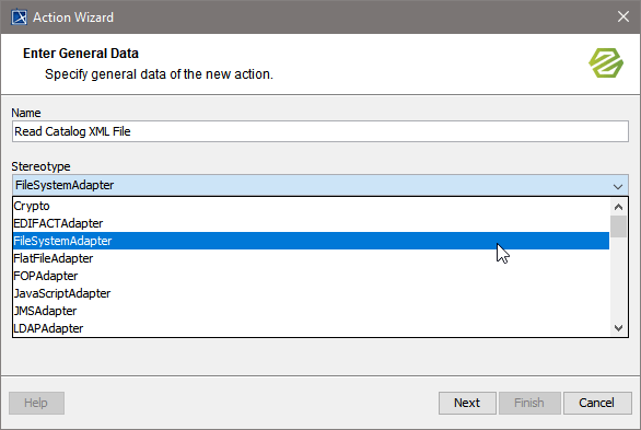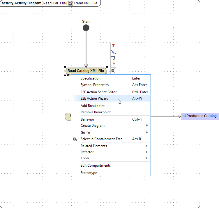 Now, you are going to implement the file reading by the help of the Action Wizard. Select the action node Read Catalog XML File and choose E2E Action Wizard from the context menu: