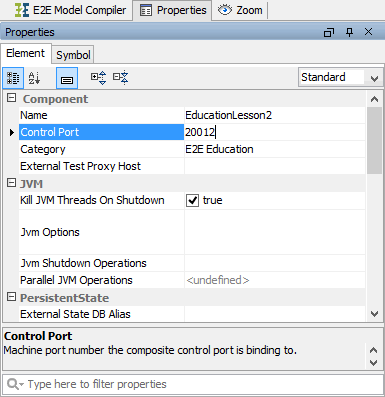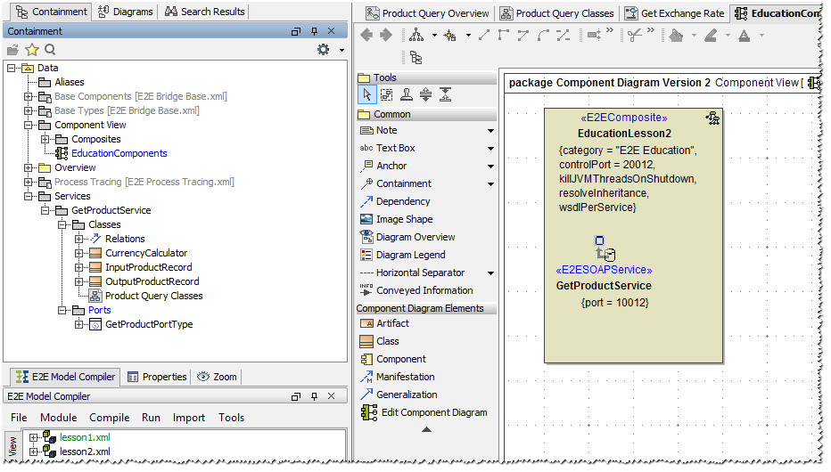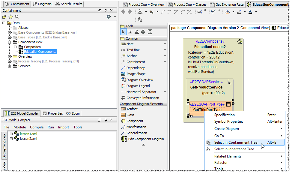 First, you will enter the new names of the xUML service components and change the port number of the SOAP service component, so both services (lesson 1 as well as lesson 2) can be run at the same time. Click the <<E2EComposite>> component EducationLesson1 to select the element: