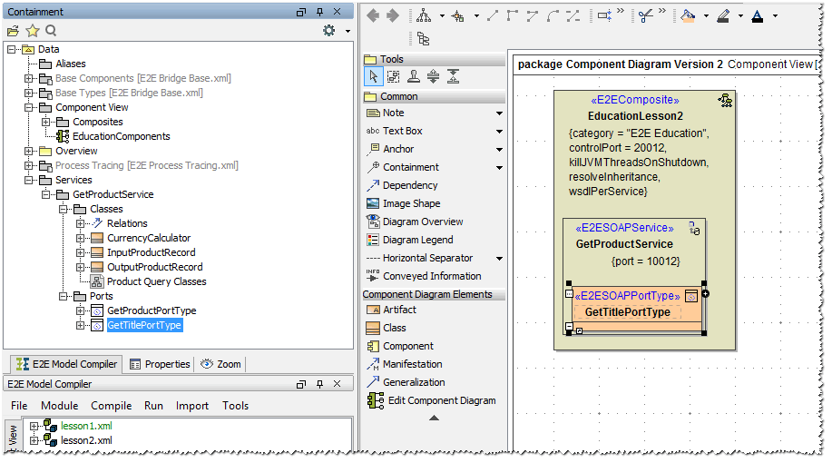 Select the service component GetTitleService in the diagram pane. In the Properties tab, change it's name to GetProductService and change the Port to 10012. Switch back to the E2E Model Compiler tab: