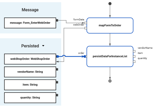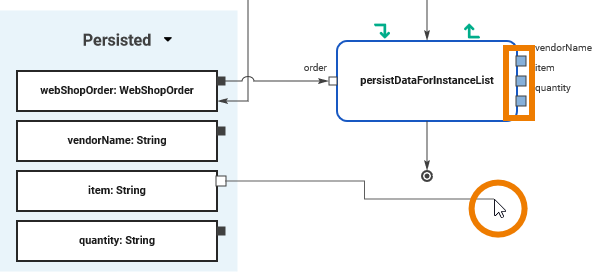 Now connect the output pins of the mapping operation to the corresponding persisted variables vendorName, item and quantity: