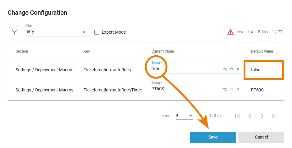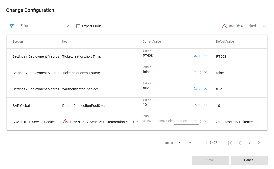 Service settings can be erroneous if a setting name contains special characters or whitespaces. Invalid service settings are marked with a red flag. Their number is also displayed on top right of the list. If a service setting is erroneous, you cannot change its current value.
