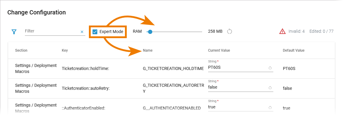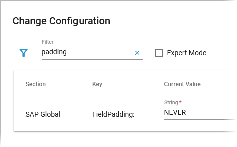 As there are many available settings, use the filter field to search for the setting you want to modify. The content of the filter field is applied to the columns Section and Key: