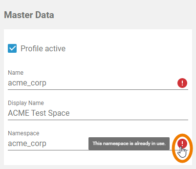 In the Master Data section, insert a Name for the profile. As the profile's name must be unique, your input is automatically checked. Your entry will also be considered for the field Display Name, if you don't insert a seperate display name: