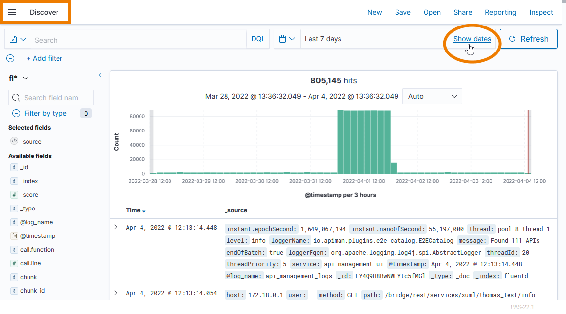 PAS logs are stored by date in a rolling index called fluentd-<YYYY.MM.DD> e.g. fluentd-2022.01.25. To ensure that all indices are fetched, set index pattern name to fl* and click Next step: