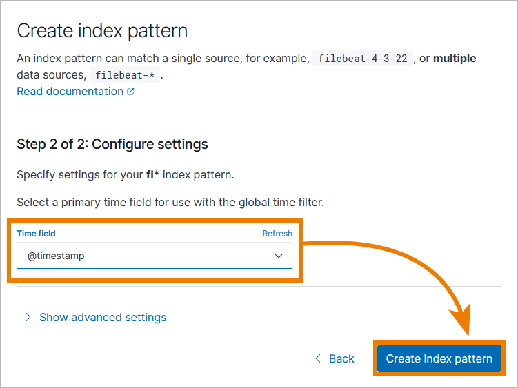 In the next window, open the drop-down list of Time field and select @timestamp. Then click Create index pattern: